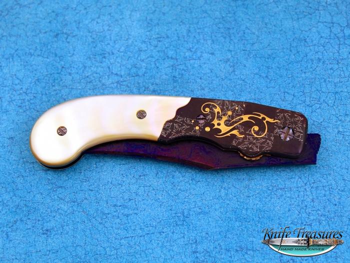 A Beautiful folder by Rick Eaton. This piece has great colors with a bright blue damascus and great Gold Lip Pearl. The Gold engraving on the bolsters really stand out on the blue damascus. The knife is marked Rick Eaton 03 on the inside of the knife.